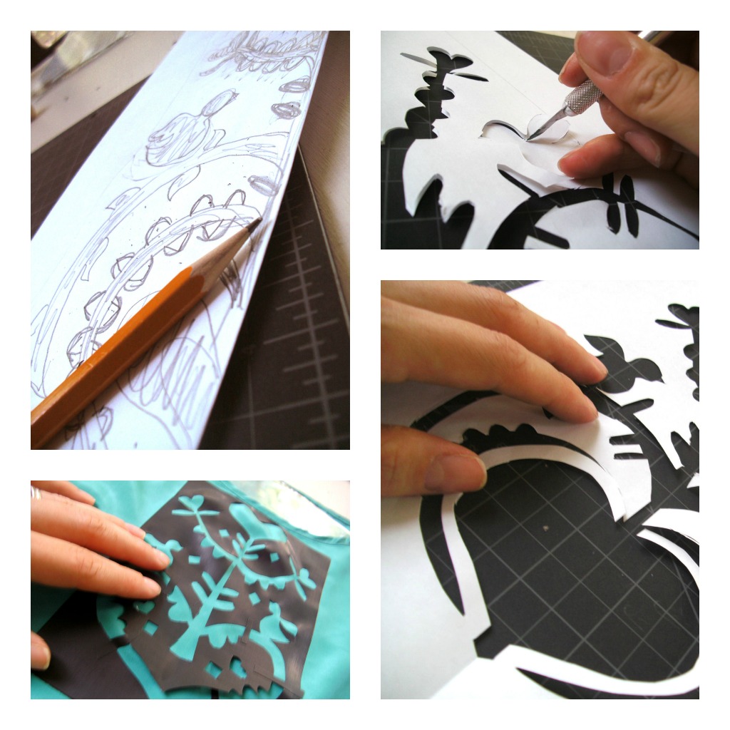 After spending hours painstakingly bent over my first wycinanka I eagerly made the first (and final) print using the stencil. Why didn’t it work? The material I had chosen for the stencil had a self-adhesive, which I thought would aid in the clarity of the print. Wrong! The adhesive stencil was so hard to pull off that I ended up ripping it into pieces, just to get it off the top. So the beautiful airy piece you see photographed here is literally one-of-a-kind – as the print making material was destroyed after its creation.